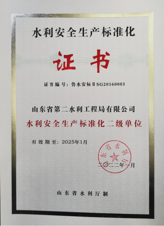 二局有限公司于近日顺利通过了山东省水利厅水利安全标准化二级达标企业延期换证。