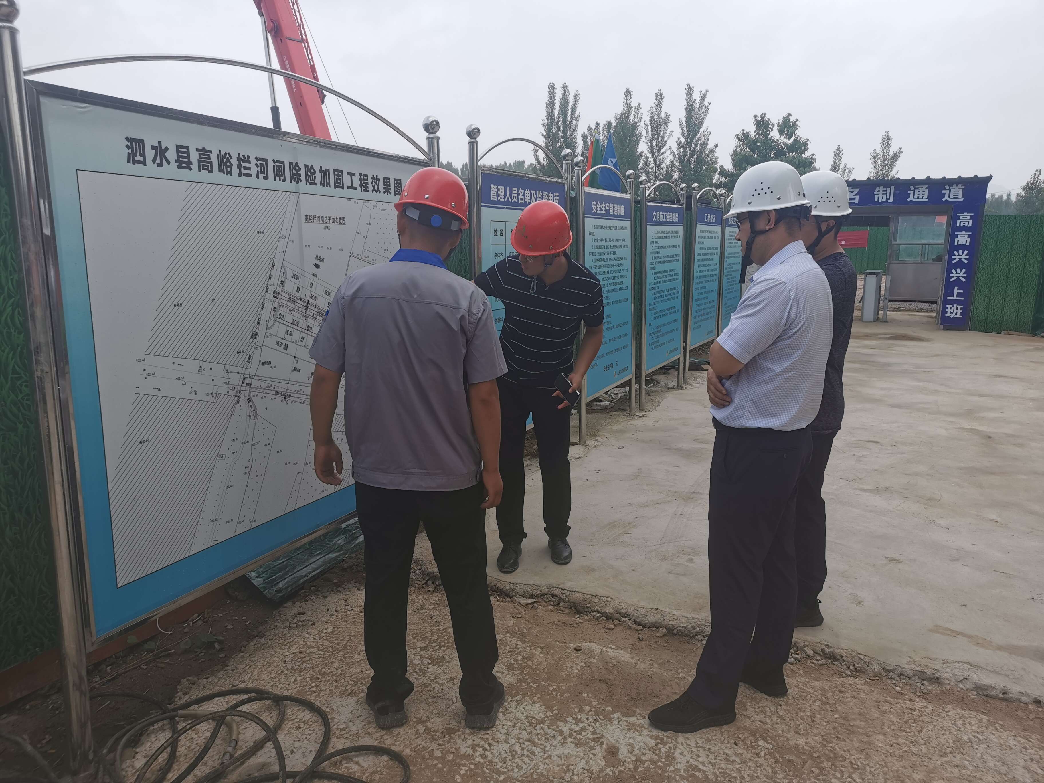 7月13日,公司安全总监郭法文、安全管理部部长向建等一行到第七分公司泗水县高峪拦河闸除险加固工程开展安全检查工作,第七分公司副总经理常征陪同检查。