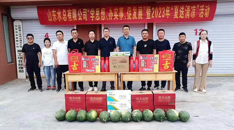 为持续推动学习贯彻习近平新时代中国特色社会主义思想主题教育走深走实,切实维护广大职工的劳动健康权益,常态化开展“我为群众办实事”实践活动,7月6日,公司总会计师杨利军到二局有限公司巨野县二支河引调水工程开展“学思想、办实事、促发展”暨2023年“夏送清凉”活动。二局有限公司党委书记、总经理王传波,副总经理刘波、李灏,总会计师王佃志等陪同参加。